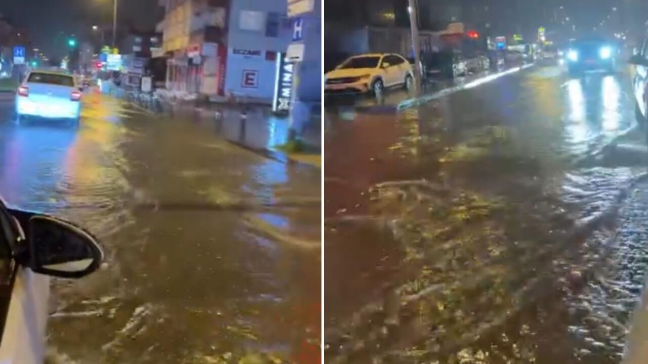 Aniden bastıran sağanak yağış caddeyi göle çevirdi