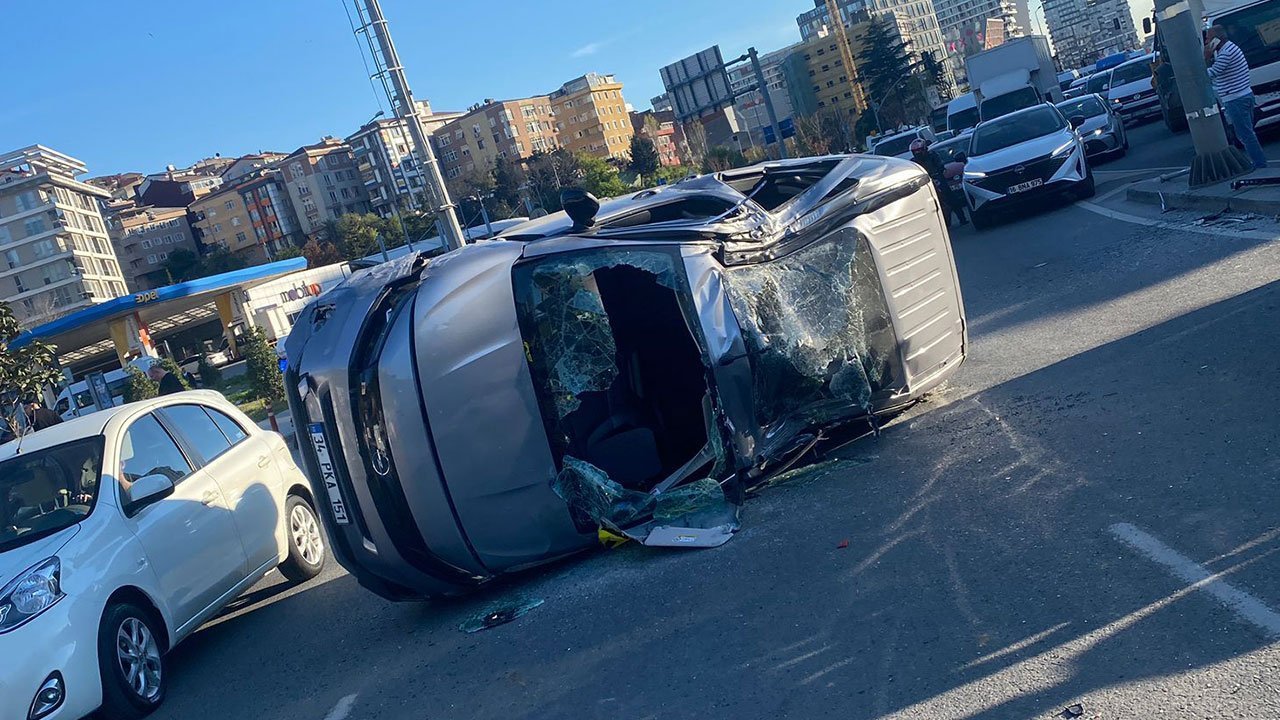 İstanbul Seyrantepe’de Fatih E.’nin kullandığı hafif ticari araç, seyir halindeyken refüjdeki trafik levhası direğine çarptı. Çarpmanın etkisiyle takla atarak devrilen araca, aynı yönde ilerleyen İlyas M.’nin kullandığı araç arkadan çarptı. Kazada İlyas M. yaralanırken, kaza anı güvenlik kamerasına yansıdı.